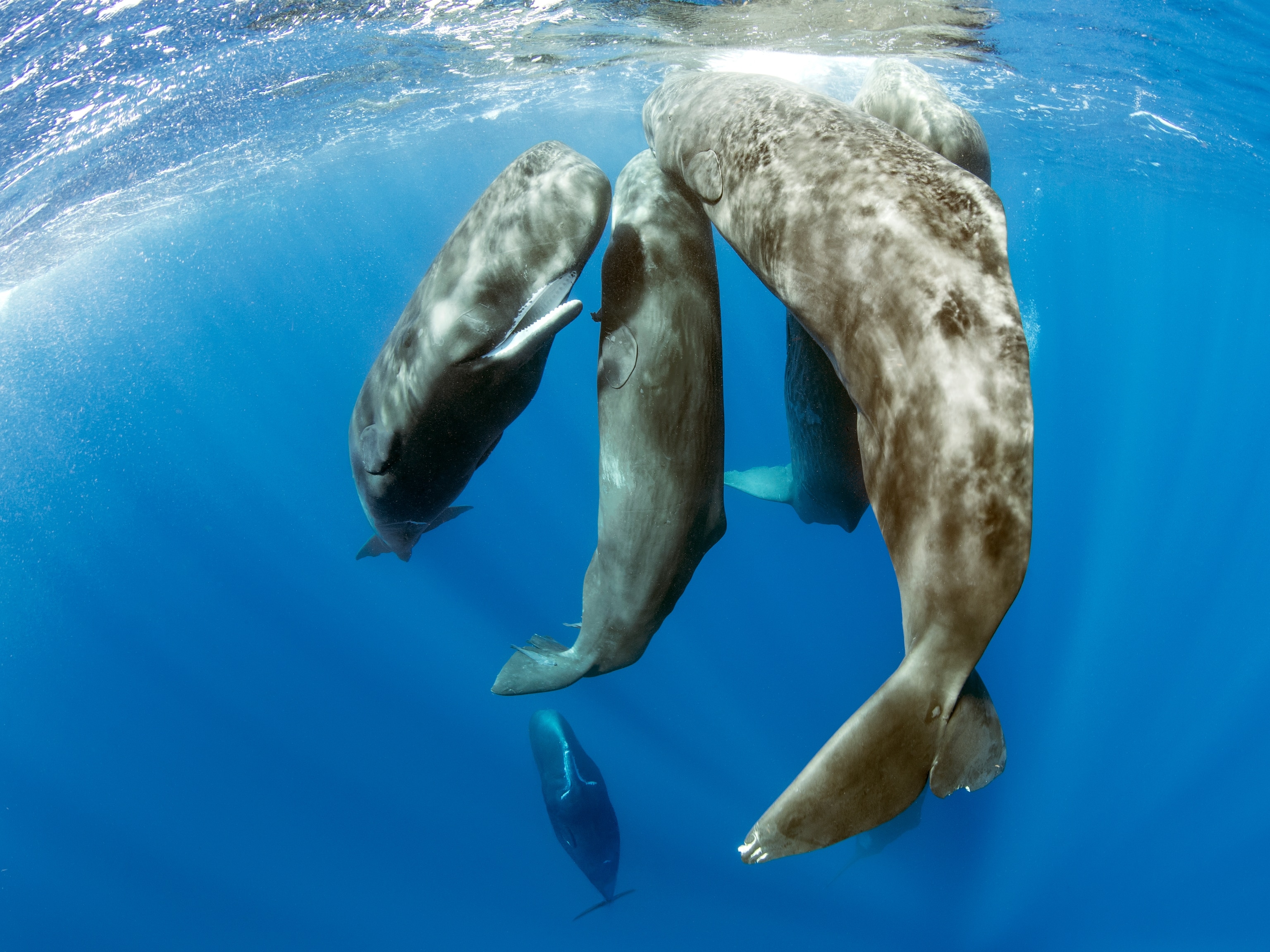 Marks on their bodies help narrow down their usual habitat. Scars on the killer whales' backs indicate damage from cookiecutter sharks—parasitic sharks that bite out chunks of tissue in a "cookiecutter" fashion, leaving circular marks.