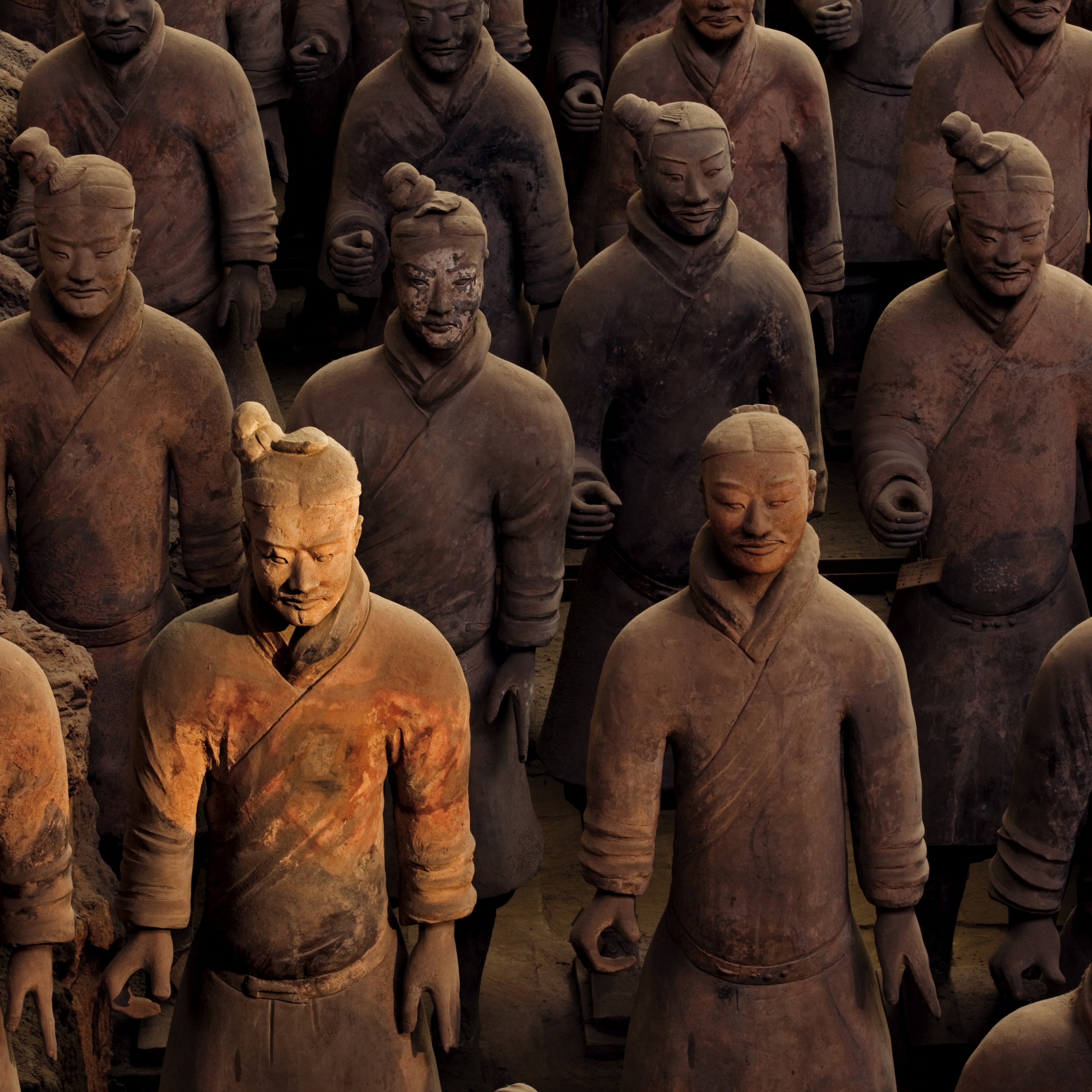 Despite the risky conditions, the Nasca flourished for eight centuries. Around 200 B.C., the Nasca people emerged out of a previous culture known as the Paracas, settling along the river valleys and cultivating crops such as cotton, beans, tubers, lucuma (a fruit), and a short-eared form of corn. Renowned for their distinctive pottery, they invented a new technique of mixing about a dozen different mineral pigments in a thin wash of clay so that colors could be baked into the pottery. A famous ceramic tableau known as the Tello plaque—showing several Nasca strolling while blowing their panpipes, surrounded by dancing dogs—has been viewed as an iconic snapshot of a peaceful people whose rituals embraced music, dance, and sacred walks.